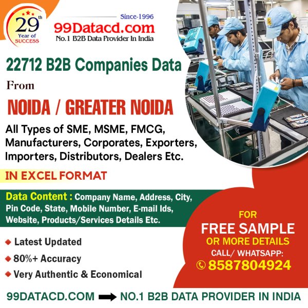 Are you looking for a list of companies in Noida? Check out 99Datacd, a B2B Database provider company in India that offers an updated list of companies in Noida to assist businesses in lead generation and market expansion. Buy 22712 Companies from NOIDA / GREATER NOIDA businesses, industries, and trades (all types Of SME, MSME, FMCG, manufacturers, corporates, exporters, importers, and distributors/dealers) list - In Excel format.